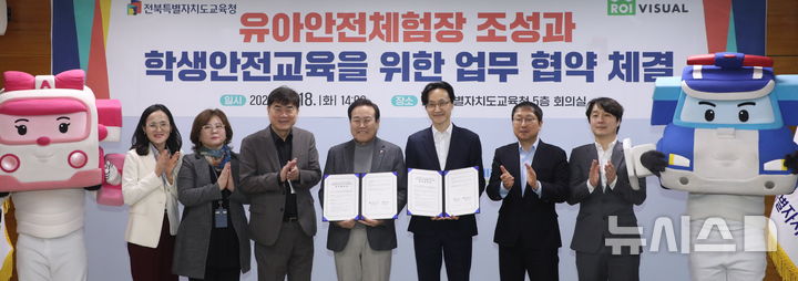 [전주=뉴시스] 김얼 기자 = 서거석(가운데) 전북특별자치도교육청 교육감과 이동우(가운데 오른쪽) (주)로이비쥬얼 대표이사를 비롯한 관계자들이 18일 전북 전주시 전북특별자치도교육청 회의실에서 열린 '유아안전체험장 조성과 학생안전교육을 위한 업무 협약식'에 참석해 협약서를 들고 기념촬영을 하고 있다. 2025.03.18. [email protected]