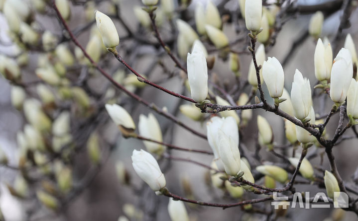 [제주=뉴시스] 우장호 기자 = 꽃샘추위가 기승을 부리는 18일 오전 제주시 용담1동 한 주택 담벼락 뒤로 목련이 피어나 시선을 끌고 있다. 2025.03.18. [email protected]