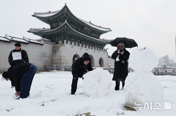 [서울=뉴시스] 김명원 기자 = 윤석열 즉각 파면을 촉구하며 단식 농성에 들어간 대학생들이 18일 오전 서울 종로구 광화문 농성장 주변에서 내린눈으로 눈사람을 만들고 있다. 2025.03.18. [email protected]