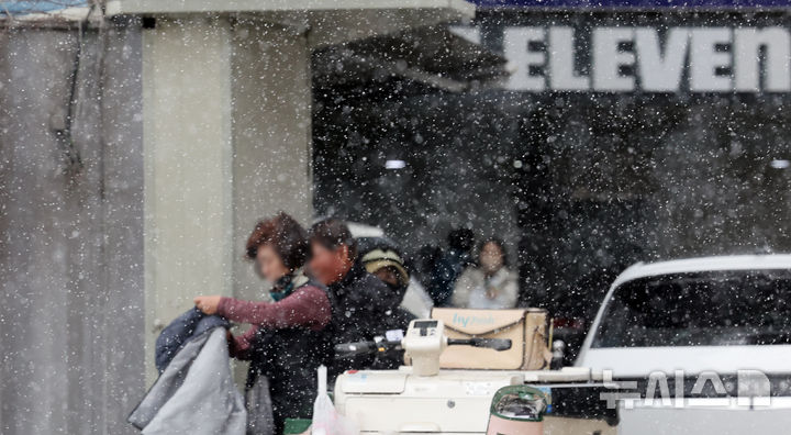 [부산=뉴시스] 하경민 기자 = 전국에 꽃샘추위가 덮친 18일 부산 동구의 한 거리에서 시민들이 흩날리는 눈을 맞으며 발걸음을 재촉하고 있다. 2025.03.18. [email protected]