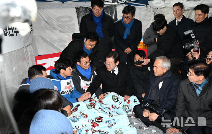 [광주=뉴시스] 김혜인 기자 = 이재명 더불어민주당 대표가 18일 오후 광주 동구 5·18민주광장에 마련된 윤석열 대통령 파면 촉구 단식 농성장을 찾아 8일째 철야 단식을 이어가는 지방의원들을 찾아 위로하고 있다. 2025.03.18. [email protected]