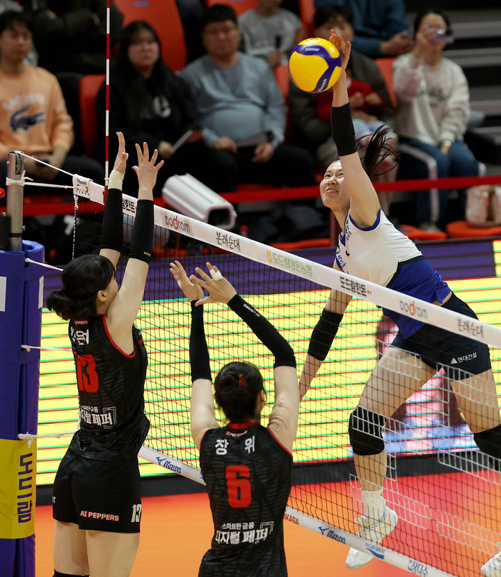 [서울=뉴시스] 김진아 기자 = 18일 광주 페퍼스타디움에서 열린 2024-25 V리그 여자부 현대건설과 페퍼저축은행의 경기, 현대건설 나현수가 공격하고 있다. (사진=현대건설 배구단 제공) 2025.03.18. [email protected] *재판매 및 DB 금지