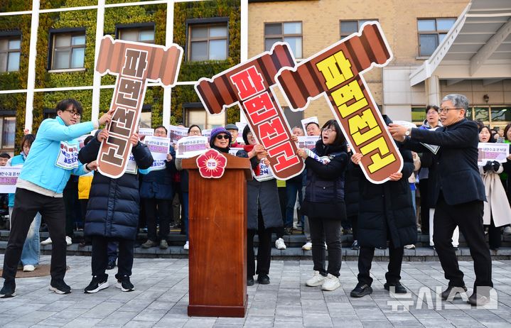 [청주=뉴시스] 서주영 기자 = 충북시민단체가 19일 충북도청에서 헌법재판소의 윤석열 대통령 탄핵 선고를 촉구하는 퍼포먼스를 하고 있다. 2025.03.19. [email protected]