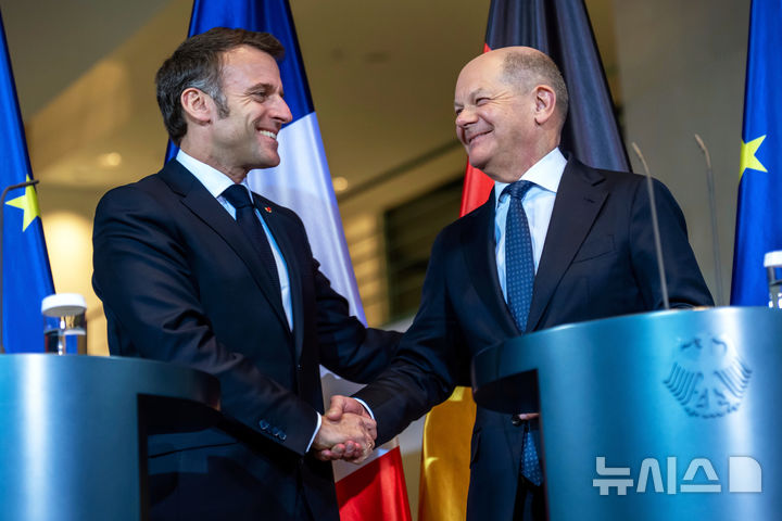 [베를린=AP/뉴시스] 에마뉘엘 마크롱(왼쪽) 프랑스 대통령과 올라프 숄츠 독일 총리가 18일(현지 시간) 베를린 연방 총리실에서 공동 기자회견 하면서 악수하고 있다. 양국 정상은 이날 미국과 러시아의 에너지 및 인프라 시설 공격을 중단하는 미-러 합의에 환영하면서도 우크라이나의 대화 참여가 중요하다고 강조했다. 2025.03.19.