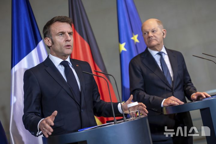 [베를린=AP/뉴시스] 에마뉘엘 마크롱(왼쪽) 프랑스 대통령과 올라프 숄츠 독일 총리가 18일(현지 시간) 베를린 연방 총리실에서 공동 기자회견하고 있다. 양국 정상은 이날 미국과 러시아의 에너지 및 인프라 시설 공격을 중단하는 미-러 합의에 환영하면서도 우크라이나의 대화 참여가 중요하다고 강조했다. 2025.03.19.