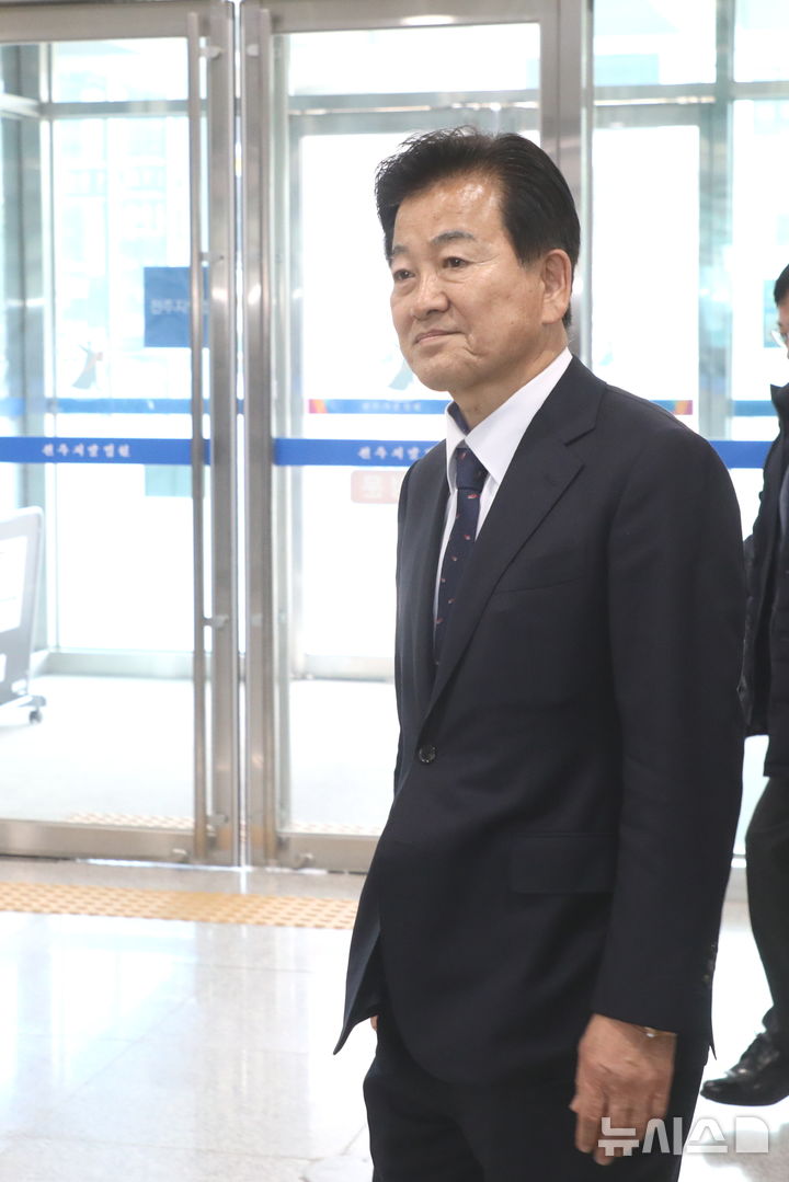 [전주=뉴시스] 김얼 기자 = 정동영 더불어민주당 국회의원(전주병)이 19일 전북 전주시 전주지방법원에서 재판을 마치고 장내를 나서고 있다. 정동영 의원은 공직선거법 위반(사전선거운동·확성장치 사용 제한·허위사실공표) 혐의로 70만원을 선고 받았다. 2025.03.19. [email protected]