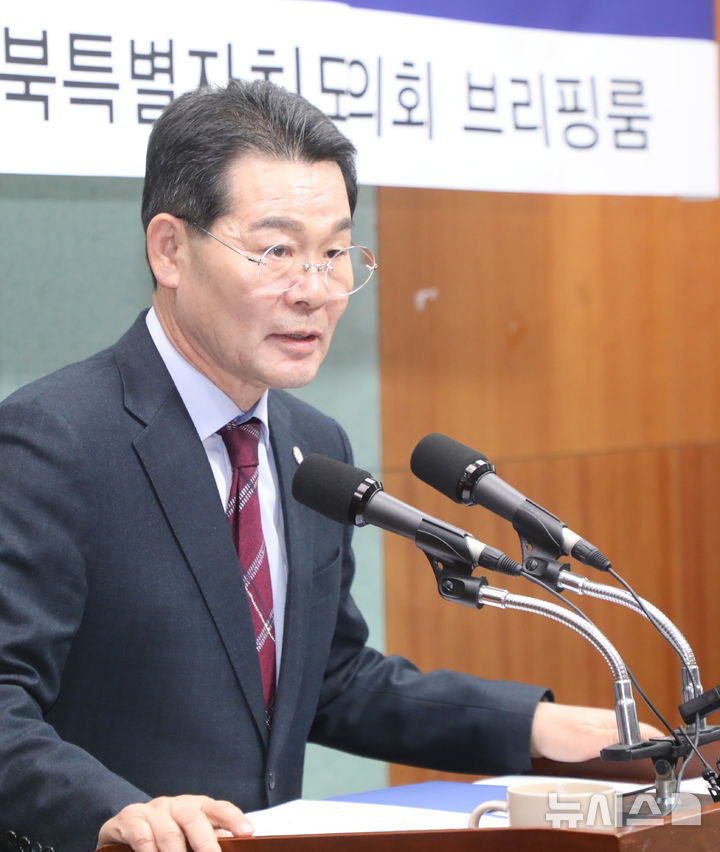 [전주=뉴시스] 김얼 기자 = 권익현 부안군수가 19일 전북 전주시 전북특별자치도의회 기자회견장에서 '아들 특혜채용 고발 관련 기자회견'을 열고 질의에 답변하고 있다. 2025.03.19. [email protected]