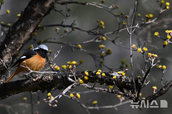[거창=뉴시스] 절기상 춘분을 하루 앞둔 19일 경남 거창군 거창읍 동변리에 꽃망울을 터트린 산수유꽃 사이로 딱새 한 마리가 날아와 앉아 있다. (사진= 거창군 제공) 2025. 03. 19. [email protected]