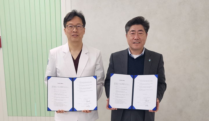 [청주=뉴시스] 이기덕(왼쪽) 아름다운플런트치과의원 대표원장과 김태수 충청북도장애인체육회 사무처장이 19일 충북 청주시 청원구 아름다운플란트치과의원에서 '장애인 구강검진 증진 및 복지 향상을 위한 업무협약'을 한 뒤 기념촬영을 하고 있다. (사진=충청북도장애인체육회 제공) 2025.03.19. [email protected]