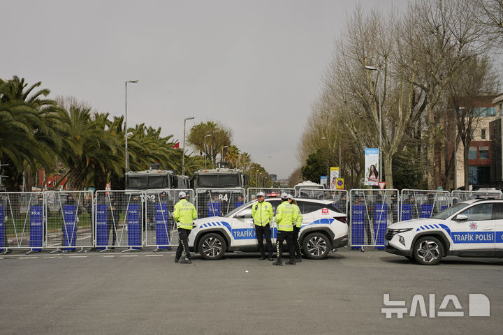 [이스탄불(튀르키예)=AP/뉴시스]튀르키예 경찰이 19일 에크렘 이마모울루 이스탄불 시장을 체포한 후 그가 이송될 것으로 보이는 바탄 보안부서로 이르는 도로를 차단하고 있다. 튀르키예 경찰은 19일 부패와 테러와의 연관성에 대한 조사의 일환으로 인기있는 야당 지도자이자 레제프 타이이프 에르도안 대통령의 핵심 경쟁자인 이스탄불 시장과 몇몇 다른 저명한 인사들을 체포, 야당과 반대 목소리에 대한 정부의 탄압을 크게 강화했다. 2025.03.19.