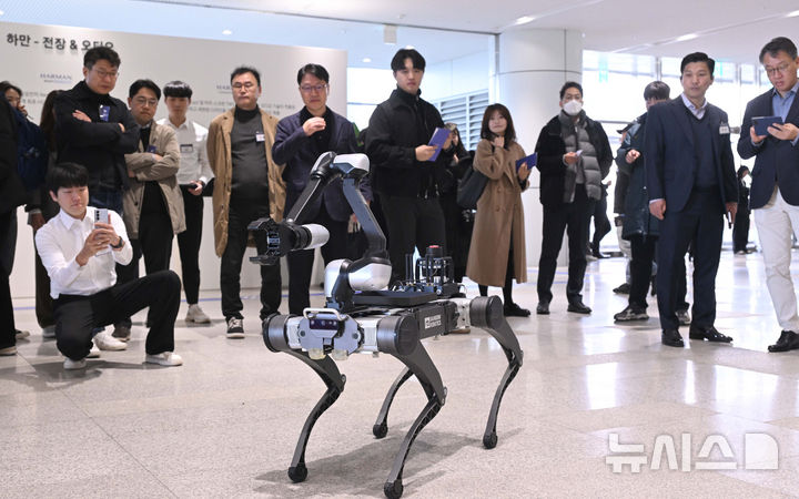 삼성전자 주총에 전시된 레인보우로보틱스 로봇 살펴보는 참석자들