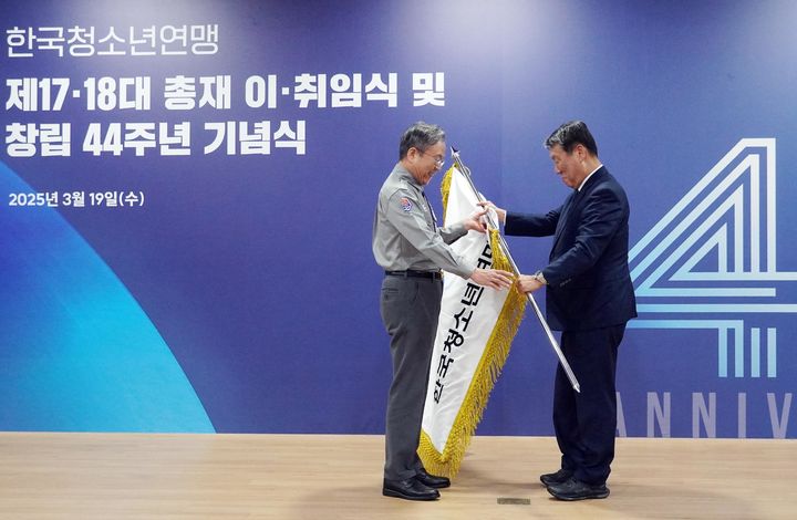 [서울=뉴시스] 19일 서울 영등포구 하이서울유스호스텔에서 열린 한국청소년연맹 창립 44주년 기념식과 제17·18대 총재 이·취임식에서 김현집 신임총재가 임호영 전임총재에게서 연맹기를 받고 있다. (사진=한국청소년연맹 제공) 2025.03.19. [email protected]