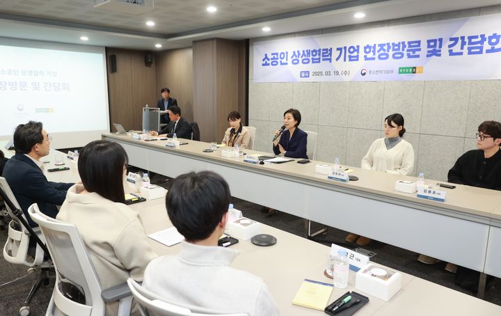 [서울=뉴시스] 오영주 중소벤처기업부 장관이 19일 서울 강남구 현대리바트 서울사무소에서 열린 '소공인 상생협력 기업 현장방문 및 간담회'에서 인사말을 하고 있다. (사진=중소벤처기업부 제공) 2025.03.19. [email protected] *재판매 및 DB 금지
