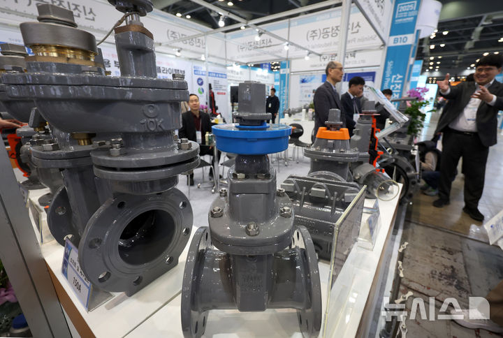 [고양=뉴시스] 김진아 기자 = 19일 경기 고양시 킨텍스에서 열린 '2025 국제물산업박람회'에서 관람객들이 다양한 기능의 제수밸브를 살펴보고 있다.