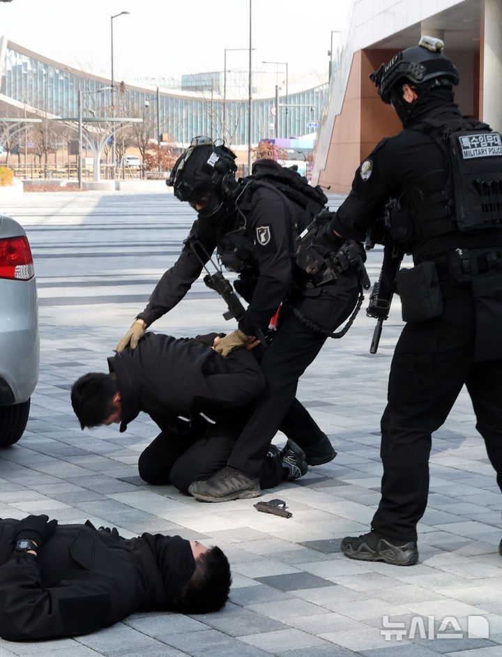 [세종=뉴시스] 강종민 기자 = 19일 세종시 어진동 정부세종청사에서 열린 국가중요시설 통합방호훈련에서 육군 32사단 특수임무대원들이 가상 테러범 진압작전을 벌이고 있다. 2025.03.19. [email protected]
