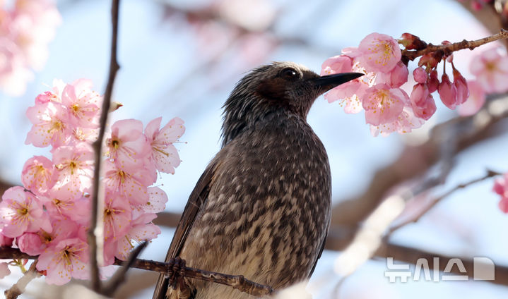 [부산=뉴시스] 하경민 기자 = 절기상 춘분을 하루 앞둔 19일 부산 수영구 배화학교 화단의 벚나무에서 직박구리가 먹이활동을 하고 있다. 2025.03.19. [email protected]