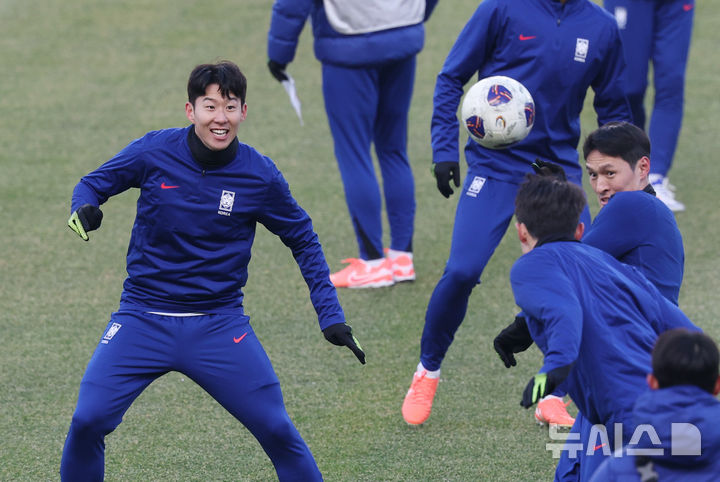 [고양=뉴시스] 김진아 기자 = 대한민국 축구대표팀 손흥민과 선수들이 19일 경기 고양종합운동장에서 3월 A매치 대비 훈련을 하고 있다.