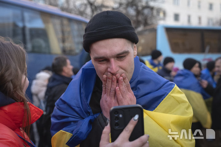 [체르느히우=AP/뉴시스] 19일(현지 시간) 러시아와 우크라이나 간 포로 교환을 마치고 체르느히우로 귀환한 우크라이나 군인이 가족과 영상 통화를 하면서 눈물을 흘리고 있다. 러시아와 우크라이나는 이날 전쟁 포로 175명씩을 맞교환했다. 2025.03.20.