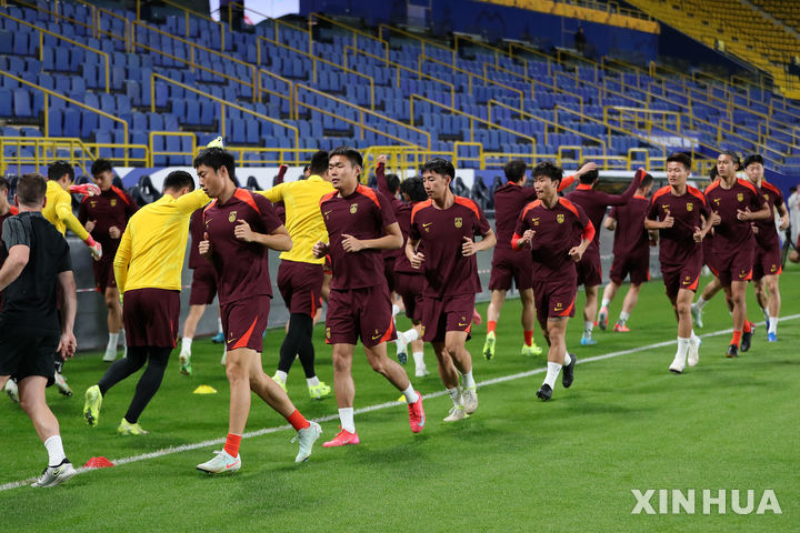 [리야드=신화/뉴시스] 중국 축구 국가대표 선수들이 19일(현지 시간) 사우디아라비아 리야드에서 2026 국제축구연맹(FIFA) 북중미 월드컵 아시아 지역 3차 예선 7차전 사우디와의 경기를 앞두고 훈련하고 있다. C조 최하위인 중국은 21일 사우디와 원정 경기를 치른다. 3차 예선 각 조 1~2위가 월드컵 본선에 직행하고, 3~4위는 아시아 예선 플레이오프로 본선 진출을 가린다. 2025.03.20.
