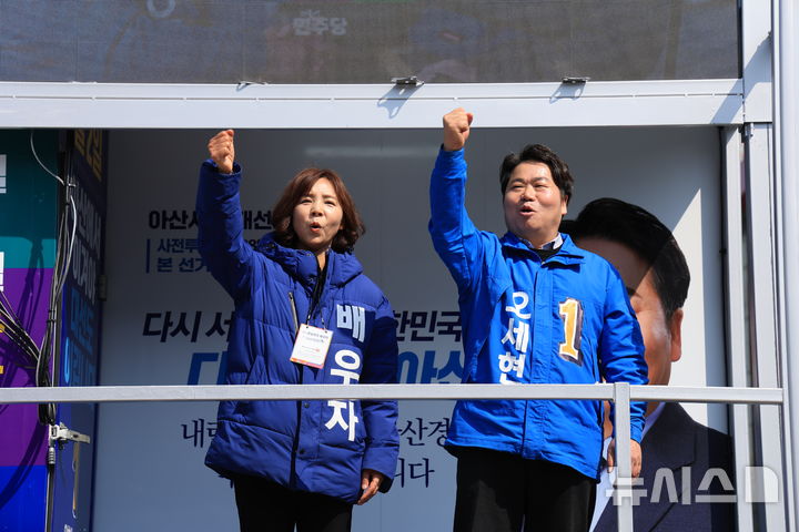[천안·아산=뉴시스] 박우경 기자 =4.2 충남 아산시장 재보궐선거 공식 선거운동 첫날 더불어민주당 오세현(오른쪽) 아산시장 후보가 선거 유세 차량에서 배우자와 함께 지지를 호소하고 있다. 2025.3.20 [email protected]