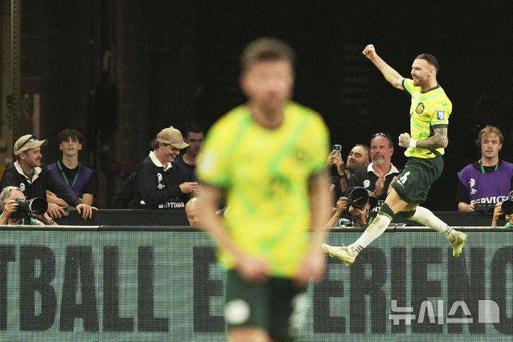 [시드니=AP/뉴시스] 마틴 보일(호주, 오른쪽)이 20일(현지 시간) 호주 시드니의 시드니 풋볼 스타디움에서 열린 2026 국제축구연맹(FIFA) 북중미 월드컵 아시아 지역 3차 예선 C조 7차전 인도네시아와의 경기 전반 16분 페널티킥(PK)으로 선제골을 넣고 세리머니하고 있다. 호주가 3-0으로 앞서며 전반전을 마쳤다. 2025.03.20.