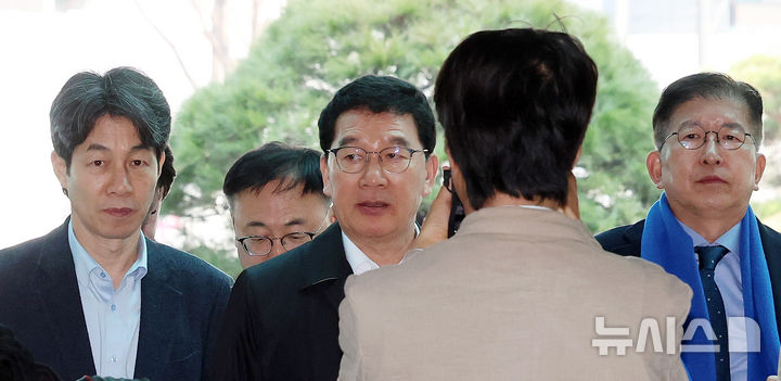 [서울=뉴시스] 이영환 기자 = 윤건영(왼쪽) 국회 행정안전위원회 더불어민주당 간사와 위원들이 19일 오후 서울 서대문구 경찰청을 찾아 국회의원 대상 계란 투척 관련 항의를 하기 위해 이동하고 있다. 2025.03.19. [email protected]
