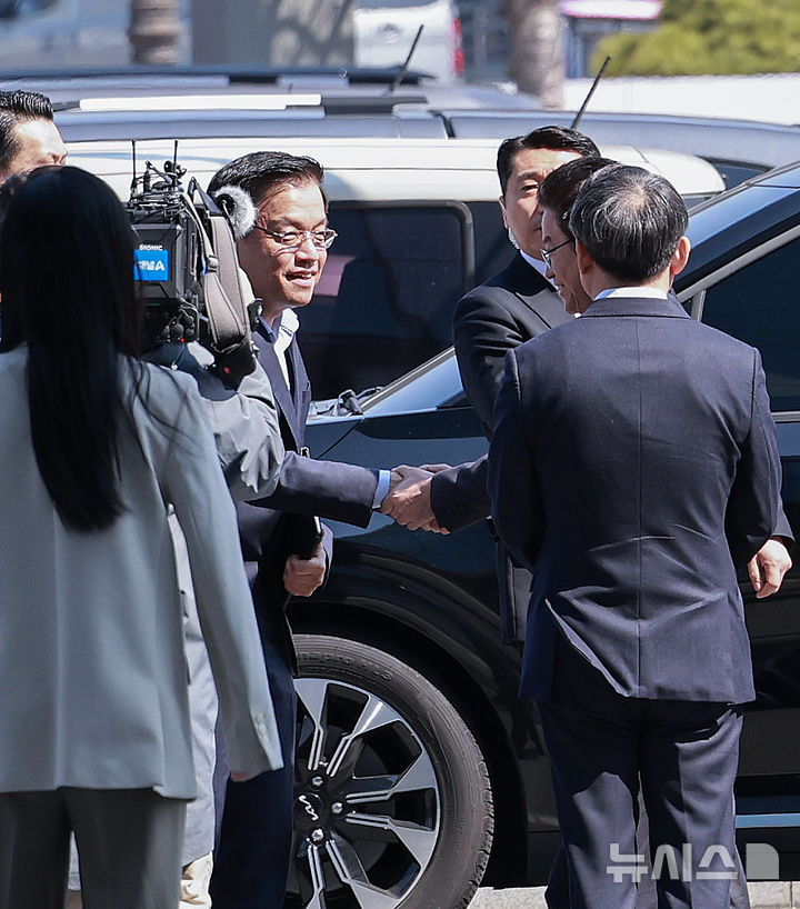 [경주=뉴시스] 최진석 기자 = 최상목 대통령 권한대행 부총리 겸 기획재정부 장관이 20일 경북 경주화백컨벤션센터(HICO)에 도착해 32차 아시아태평양경제협력체(APEC) 정상회의 준비 상황을 점검에 앞서 이철우 경북도지사와 악수하고 있다. (대통령실통신사진기자단) 2025.03.20. [email protected]