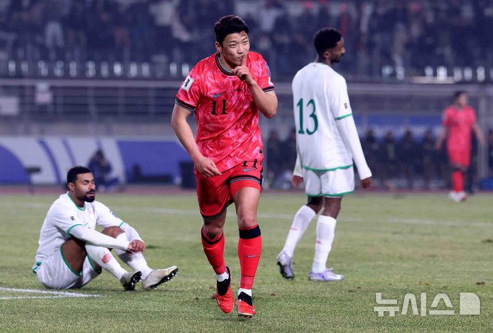 [고양=뉴시스] 추상철 기자 = 20일 오후 경기 고양시 고양종합운동장에서 열린 '2026 국제축구연맹(FIFA) 북중미 월드컵 아시아 지역 3차 예선 B조 7차전' 대한민국과 오만의 경기, 황희찬이 골을 성공시킨 후 기뻐하고  있다. 2025.03.20. [email protected]