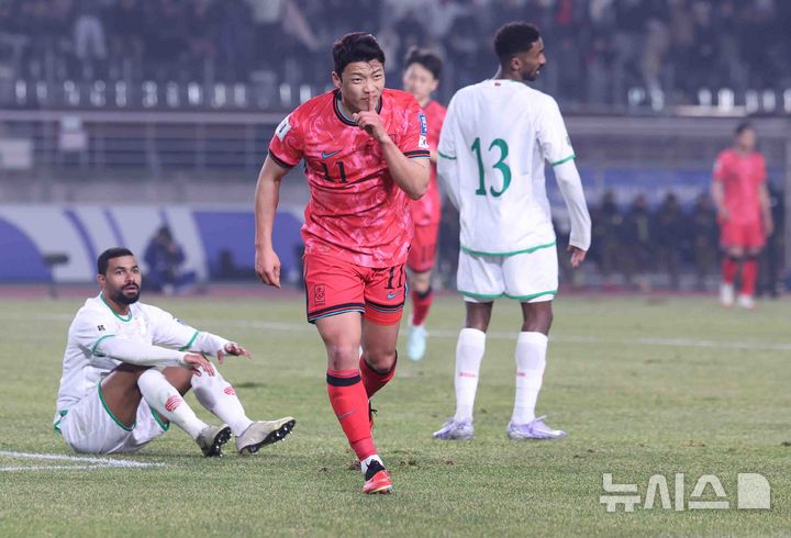 [고양=뉴시스] 추상철 기자 = 20일 오후 경기 고양시 고양종합운동장에서 열린 '2026 국제축구연맹(FIFA) 북중미 월드컵 아시아 지역 3차 예선 B조 7차전' 대한민국과 오만의 경기, 황희찬이 골을 성공시킨 후 기뻐하고  있다. 2025.03.20. [email protected]