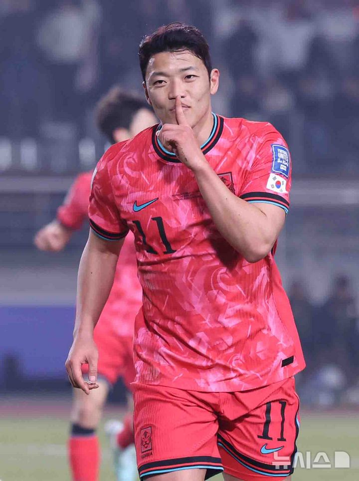 [고양=뉴시스] 추상철 기자 = 20일 오후 경기 고양시 고양종합운동장에서 열린 '2026 국제축구연맹(FIFA) 북중미 월드컵 아시아 지역 3차 예선 B조 7차전' 대한민국과 오만의 경기, 황희찬이 골을 성공시킨 후 기뻐하고 있다. 2025.03.20. [email protected]