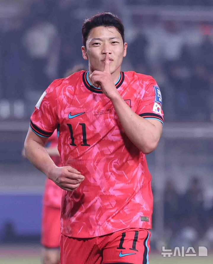[고양=뉴시스] 추상철 기자 = 20일 오후 경기 고양시 고양종합운동장에서 열린 '2026 국제축구연맹(FIFA) 북중미 월드컵 아시아 지역 3차 예선 B조 7차전' 대한민국과 오만의 경기, 황희찬이 골을 성공시킨 후 기뻐하고  있다. 2025.03.20. [email protected]