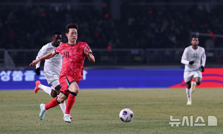 [고양=뉴시스] 김선웅 기자 = 20일 오후 경기 고양시 고양종합운동장에서 열린 '2026 국제축구연맹(FIFA) 북중미 월드컵 아시아 지역 3차 예선 B조 7차전' 대한민국과 오만의 경기, 이재성이 드리블을 하고 있다. 2025.03.20. [email protected]