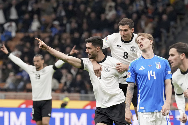 [밀라노=AP/뉴시스] 독일의 팀 클라인딘스트(가운데)가 20일(현지 시간) 이탈리아 밀라노의 산시로에서 열린 2024-25 유럽축구연맹(UEFA) 네이션스리그 8강 1차전 이탈리아와 경기 후반 4분 헤더 동점 골을 넣고 세리머니하고 있다. 독일은 요주아 키미히의 도움 2개에 힘입어 이탈리아에 2-1 역전승을 거뒀다. 2025.03.21.
