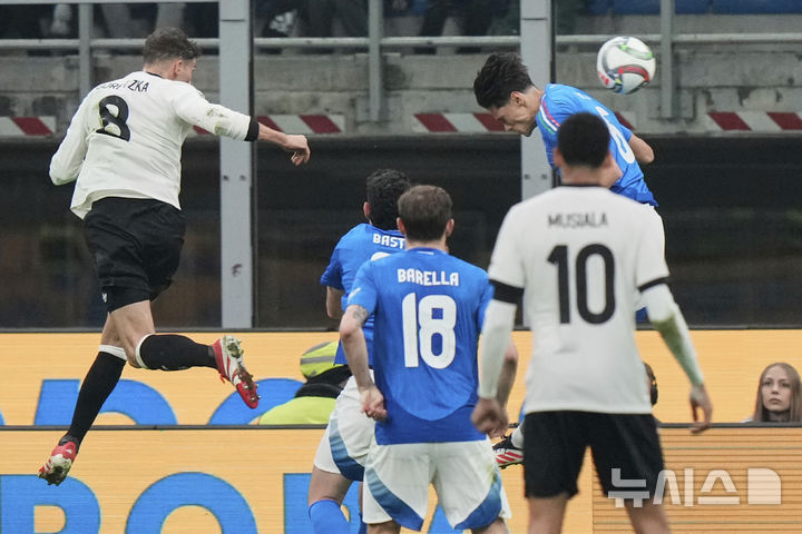 [밀라노=AP/뉴시스] 독일의 레온 고레츠카(왼쪽)가 20일(현지 시간) 이탈리아 밀라노의 산시로에서 열린 2024-25 유럽축구연맹(UEFA) 네이션스리그 8강 1차전 이탈리아와 경기 후반 31분 헤더 역전 골을 넣고 있다. 독일은 요주아 키미히의 도움 2개에 힘입어 이탈리아에 2-1 역전승을 거뒀다. 2025.03.21.