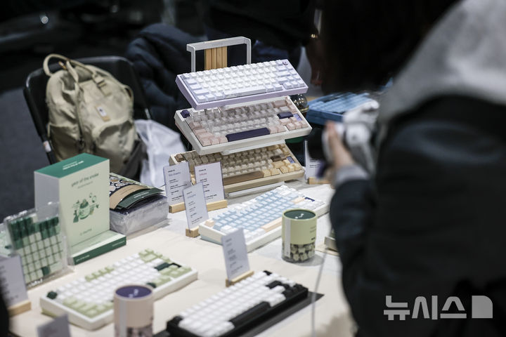 [서울=뉴시스] 정병혁 기자 = 21일 서울 강남구 세텍에서 열린 제2회 서울 기계식 키보드 박람회를 찾은 참관객들이 키보드와 키보드 용품을 살펴보고 있다. 2025.03.21. [email protected]