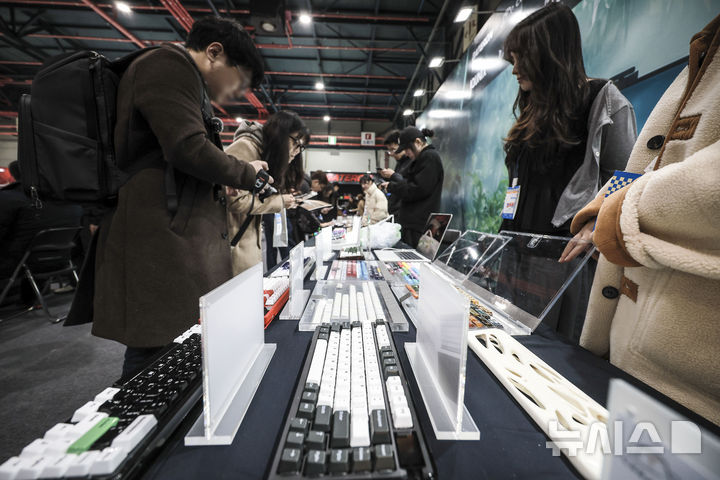 [서울=뉴시스] 정병혁 기자 = 21일 서울 강남구 세텍에서 열린 제2회 서울 기계식 키보드 박람회를 찾은 참관객들이 키보드와 키보드 용품을 살펴보고 있다. 2025.03.21. [email protected]