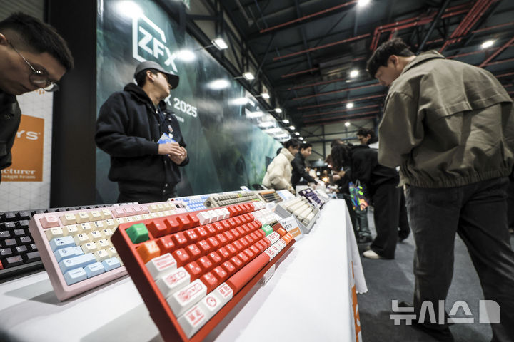 [서울=뉴시스] 정병혁 기자 = 21일 서울 강남구 세텍에서 열린 제2회 서울 기계식 키보드 박람회를 찾은 참관객들이 키보드와 키보드 용품을 살펴보고 있다. 2025.03.21. [email protected]