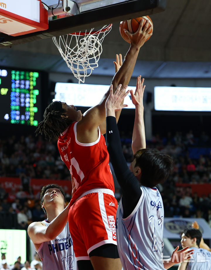 [서울=뉴시스] 황준선 기자 = 21일 서울 송파구 잠실학생체육관에서 열린 프로농구 2024~2025 KBL리그 서울 SK 나이츠와 울산 현대모비스 피버스의 경기, SK 힉스가 슛 하고 있다. 2025.03.21. [email protected]