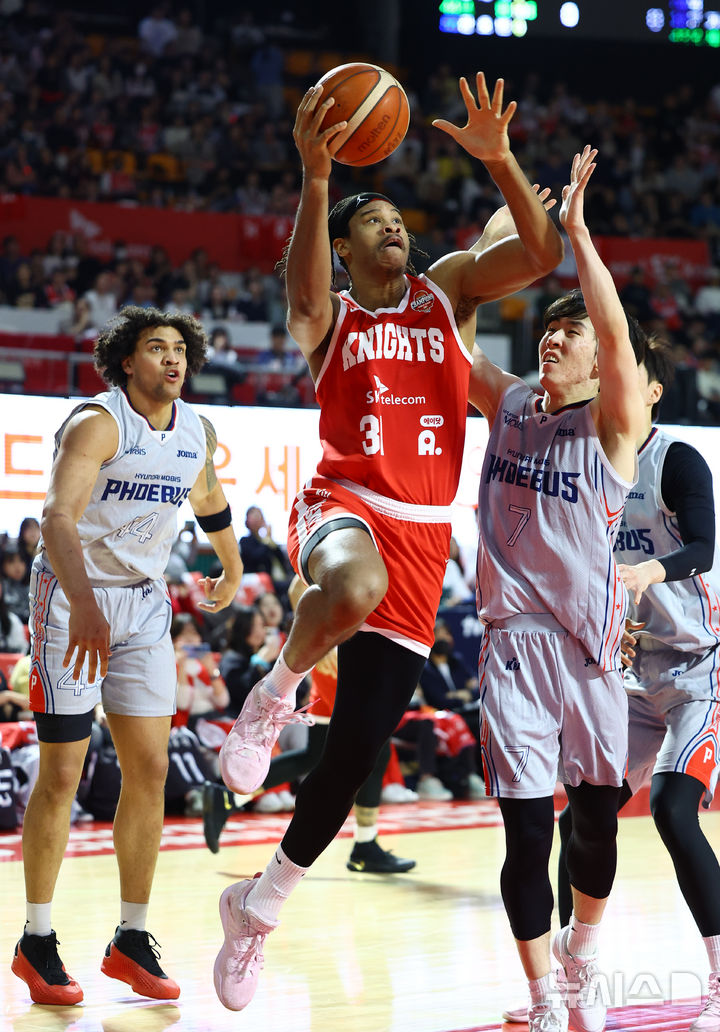 [서울=뉴시스] 황준선 기자 = 21일 서울 송파구 잠실학생체육관에서 열린 프로농구 2024~2025 KBL리그 서울 SK 나이츠와 울산 현대모비스 피버스의 경기, SK 힉스가 슛 하고 있다. 2025.03.21. [email protected]