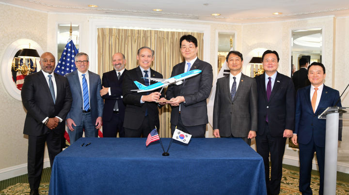 [서울=뉴시스] 추상철 기자 = 21일(현지 시간) 미국 워싱턴 D.C.에서 열린 ‘대한항공, 보잉, GE 3사 협력 강화를 위한 서명식’에서 안덕근(오른쪽 세번째부터) 산업통상자원부 장관, 조원태 한진그룹 회장, 하워드 러트닉(왼쪽 세번째부터) 미국 상무부 장관, 켈리 오트버그 보잉 최고 경영자, 러셀 스톡스(왼쪽) GE에어로스페이스 상용기 엔진 및 서비스 사업부 사장 겸 최고 경영자 등 양국 정부 및 기업 대표 관계자들이 기념촬영을 하고 있다. (사진= 대한항공 제공) 2025.03.22. [email protected]