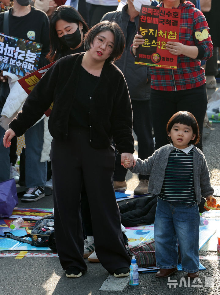 [서울=뉴시스] 이영환 기자 = 용혜인 기본소득당 대표가 22일 오후 서울 종로구 광화문 동십자각 일대에서 열린 윤석열 대통령 탄핵 촉구 집회에 아들과 참석하고 있다. 2025.03.22. [email protected]