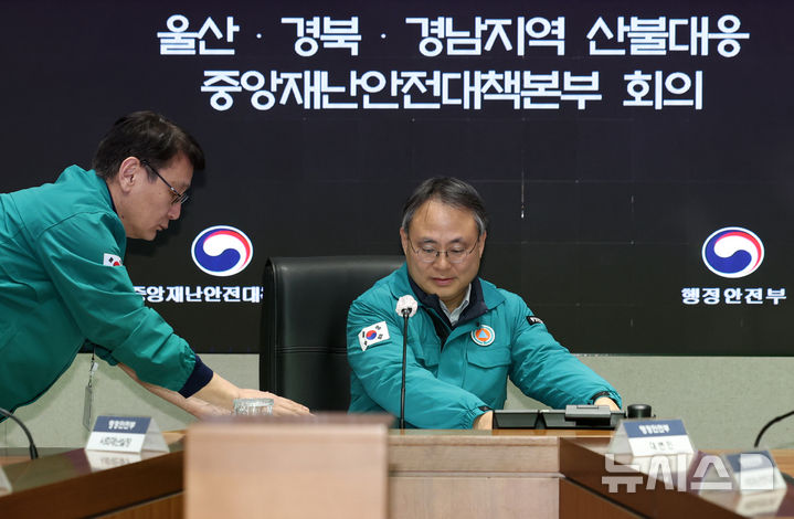 [서울=뉴시스] 이영환 기자 = 고기동 행정안전부 장관 직무대행이 22일 오후 서울 종로구 정부서울청사에서 열린 울산·경북·경남지역 산불대응 중앙재난안전대책본부 회의에 참석해 자료를 살펴보고 있다. 2025.03.22. [email protected]