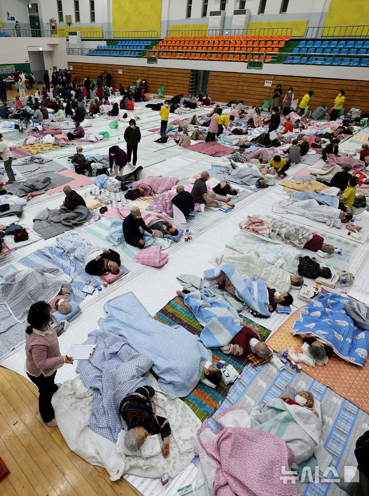 [의성=뉴시스] 이무열 기자 = 22일 오후 경북 의성군 안평면 괴산리에서 발생한 산불이 확산하며 주민들이 의성실내체육관으로 대피해있다. 2025.03.22. [email protected]