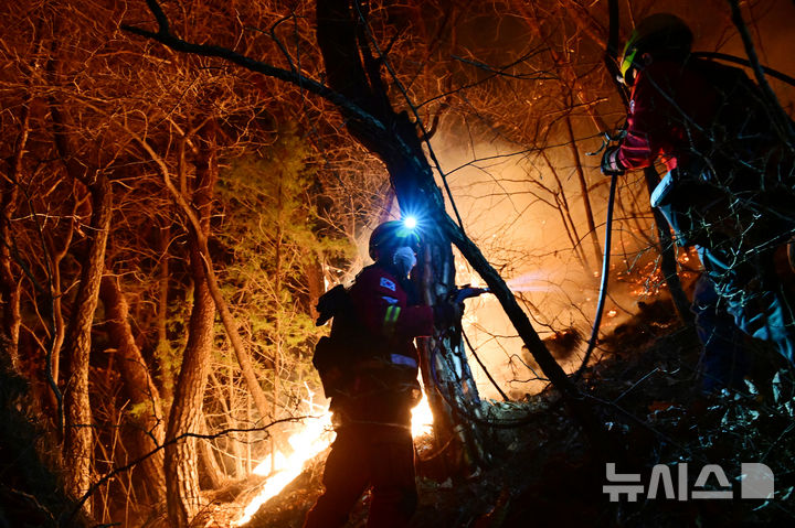 [산청=뉴시스] 차용현 기자 = 22일 오후 전날 경남 산청에서 발생한 산불이 산등성이를 타고 확산되고 있는 가운데 산림청 소속 공중진화대가 산불을 진화하고 있다. 2025.03.22. [email protected]