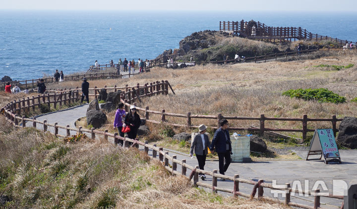 [서귀포=뉴시스] 우장호 기자 = 낮 기온이 25도에 육박하는 23일 제주 서귀포시 성산읍 섭지코지를 찾은 관광객들이 완연한 봄기운을 만끽하며 산책을 즐기고 있다. 2025.03.23. [email protected]