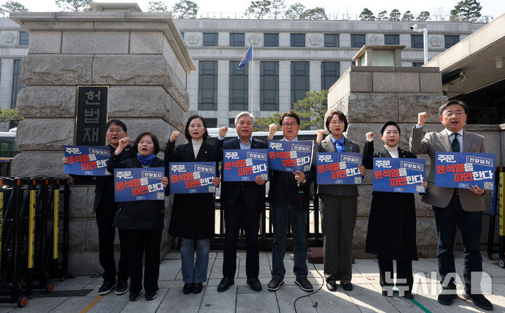 [서울=뉴시스] 홍효식 기자 = 조국혁신당 황운하 원내대표를 비롯한 의원들이 23일 서울 종로구 헌법재판소 앞에서 기자회견을 열고 윤석열 대통령 만장일치 파면을 촉구하고 있다. 2025.03.23. [email protected]