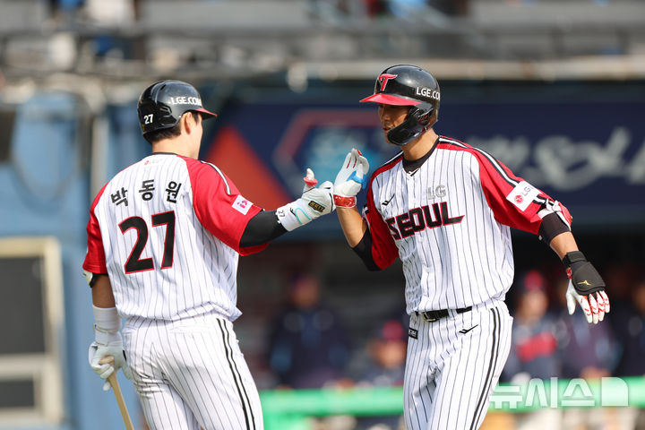 [서울=뉴시스] 김명년 기자 = 23일 오후 서울 송파구 잠실야구장에서 열린 프로야구 2025 KBO리그 롯데 자이언츠 대 LG 트윈스의 경기, 6회말 1사 주자 없는 상황 LG 송찬의가 홈런을 치고 박동원과 기쁨을 나누고 있다. 2025.03.23. [email protected]