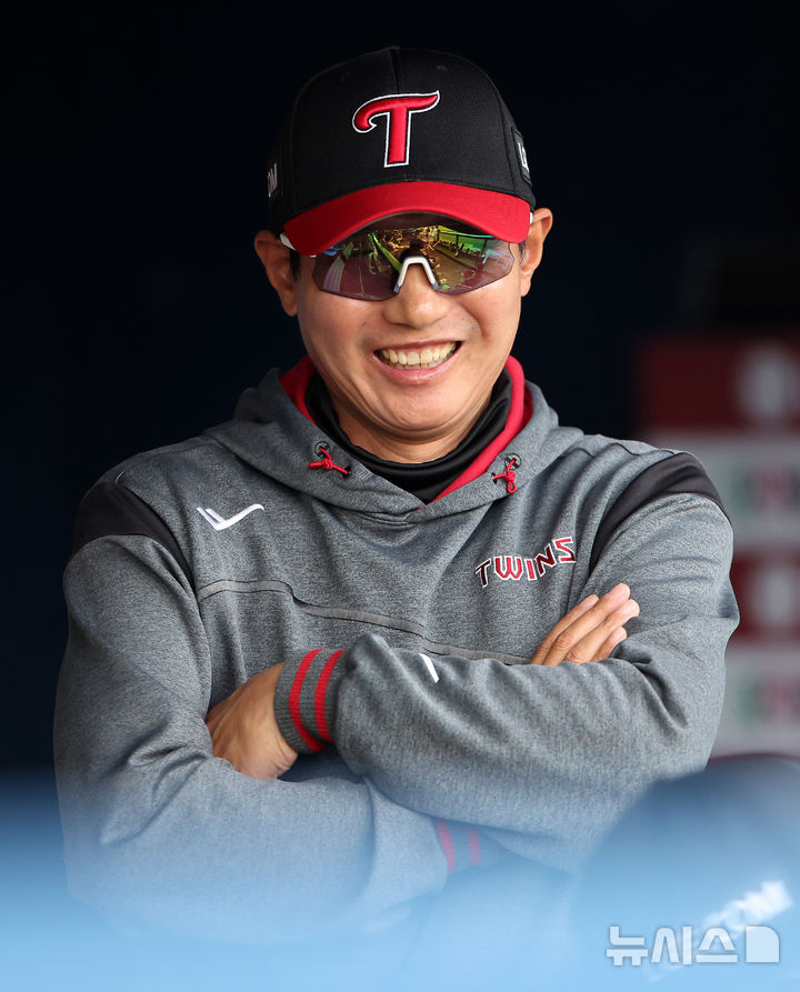 [서울=뉴시스] 김명년 기자 = 23일 오후 서울 송파구 잠실야구장에서 열린 프로야구 2025 KBO리그 롯데 자이언츠 대 LG 트윈스의 경기, LG 염경엽 감독이 8회말 문정빈이 홈런을 치자 환하게 웃고 있다. 2025.03.23. [email protected]