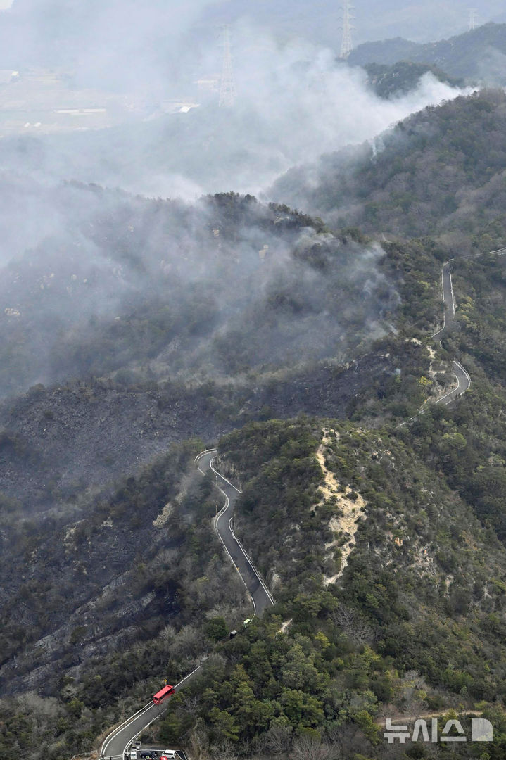 [오카야마=AP/뉴시스] 24일 일본 서부 오카야마에 전날 발생한 산불로 연기가 치솟고 있다. 23일 오카야마에서 발생한 산불로 오카야마와 다마노 일대 250㏊를 태웠으며, 에히메현 이마바리에서도 산불이 발생해 24일 오전 7시까지 119㏊를 태운 것으로 알려졌다. 2025.03.24.