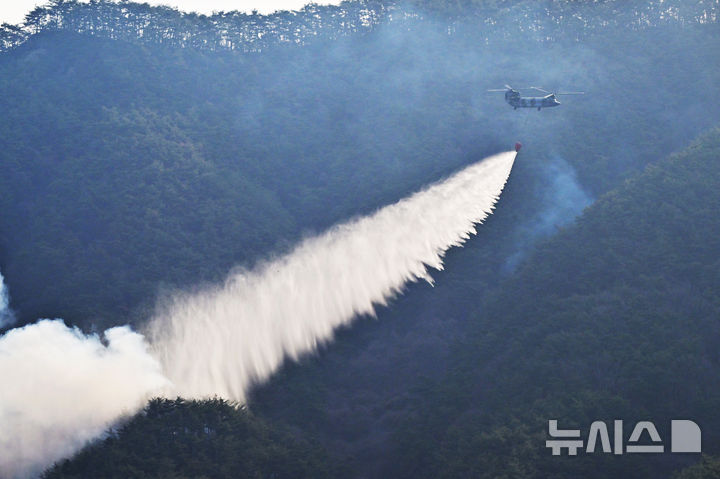 [산청=뉴시스] 차용현 기자 = 경남 산청군에서 발생한 대형 산불이 4일째로 접어든 24일 오전 아침이 밝아오자 산불진화에 투입된 군용 헬기가 진화작업을 펼치고 있다. 2025.03.24. [email protected]